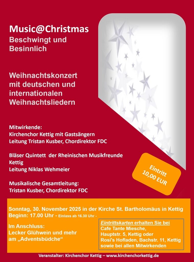 Am Sonntag, den 30. November 2025, lädt der Kirchenchor Kettig mit Gastsängerngemeinsam mit dem Bläser-Quintett der Rheinischen Musikfreunde Kettig zu einem festlichen Konzert in die Pfarrkirche St. Bartholomäus ein.