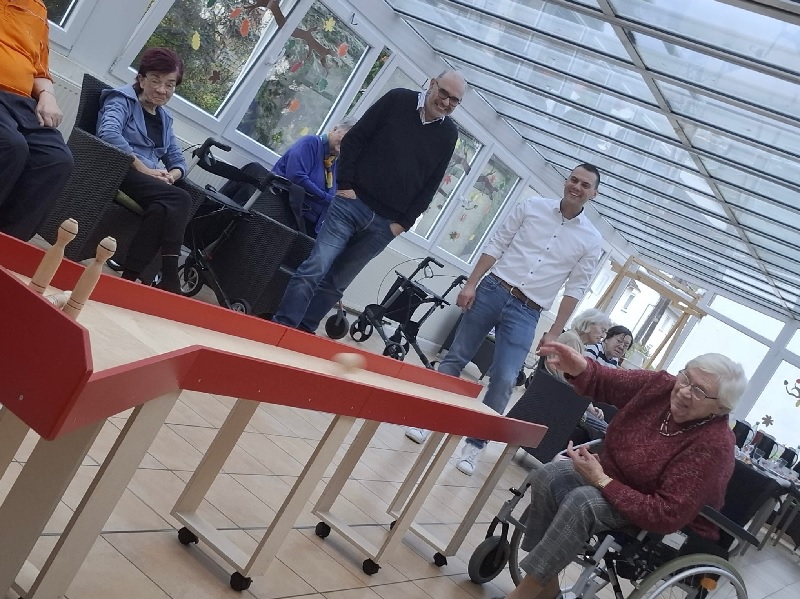 Die AWO hat diesen Impuls aufgegriffen und im Laufe des Jahres eine eigene Kegelbahn angeschafft, die inzwischen regelmäßig und mit großer Begeisterung genutzt wird. Die Ortsgemeindeverwaltung wurde spontan eingeladen, die bereits etablierte Kegelrunde der Bewohnerinnen und Bewohner zu begleiten. Mit viel Humor, Applaus, einigen gut gemeinten Tipps und einer großen Portion Freude wurde gemeinsam gekegelt – ein Moment, der allen Beteiligten sichtbar gutgetan hat.